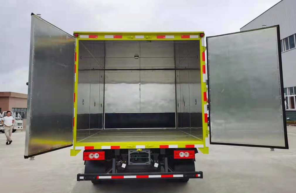 1、該車適用于運(yùn)輸危險(xiǎn)品。廂體頂部封閉,不可開啟。該車用于運(yùn)輸具有**容器(瓶)包裝的爆炸品。類項(xiàng)號(hào):1.1B,1.1G,1.3C,1.1D,1.2D,1.3C,1.1C,1.4G。2、側(cè),后防護(hù)材料均為Q235,螺栓連接;后防護(hù)截面尺寸**×50mm。下邊緣離地高410mm。廂體側(cè)面選裝開門型式及位置,選裝不帶側(cè)開門,選裝瓦楞板結(jié)構(gòu);廂體側(cè)面板選裝開百葉窗。3、隨底盤選裝排半駕駛室,選裝導(dǎo)流罩。僅選用排氣管前置、限速裝置(限速80km/h)、前輪盤式制動(dòng)及子午線輪胎的底盤;轉(zhuǎn)向輪裝備輪胎爆胎應(yīng)急防護(hù)裝置。安裝帶衛(wèi)星定位功能的行駛記錄儀。ABS系統(tǒng)型號(hào):ABS-VI.E;生產(chǎn)企業(yè):廣州瑞立科密汽車電子股份有限公司.ABS系統(tǒng)型號(hào):ABS-E;生產(chǎn)企業(yè):威伯科汽車**系統(tǒng)(**)有限公司。發(fā)動(dòng)機(jī)/油耗值(L/**km)對(duì)應(yīng)關(guān)系為:CY4SK261/16.09,D30TCIF1/16.19,F2.8NS6B156/15.39,F3.8NS6B156/14.90,Q28-130E60/16.14??蛇x裝ETC車載裝置。 |